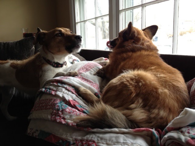 We all sat awkwardly at an airport table trying to make small talk and make plans. I was still sweating and shaking from the coursing adrenaline- it was almost an out of body experiene. Stephanie took a picture and that started to break the ice. Finally we making the hour drive from Nantes to Rennes where Louise and Gildas live. We piled into the BMW, sang along to mostly American songs on the radio, and attempted naps. We made a stop for tea at Adeline and Anthony's flat before lugging our bags to our flat. Adeline and Anthony have a dog named Figi and enjoyed watching videos of Dharma and Bizi playing in the snow.